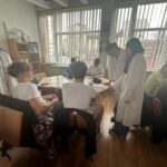 Ora a început și emoțiile pe care le aveam au trebuit să dispară, pentru a-i face pe copii să înțeleagă lecția și pentru a le stârni interesul. Gabriela a început printr-o discuție despre noțiunile ce urma să le punem în aplicare, și anume oxizii, bazele, acizii și sărurile. După recapitulare, le-a oferit elevilor de la fiecare masă câte o fișă de lucru pe care să o rezolve împreună. În tot acest timp, Gabriela și Adelina s-au plimbat printre mese și au discutat cu copiii, ajutându-i cu termenii neștiuți de aceștia. După 10 minute și după ce toate fișele au fost rezolvate, au început experimentele. Doamna profesoară Anca Hogea ne-a acompaniat pas cu pas, dându-ne multe sfaturi folositoare legate de cum pot copiii să rețină mai ușor lucrurile făcute.