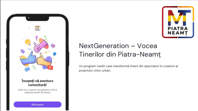Primăria Municipiului Piatra-Neamț lansează NextGeneration – un program unic dedicat tinerilor care vor să conteze cu adevărat. Scopul este de a forma o echipă de tineri elevi vizionari și creativi, capabili să coordoneze proiecte reale, să propună idei îndrăznețe și să devină lideri autentici ai propriei generații.